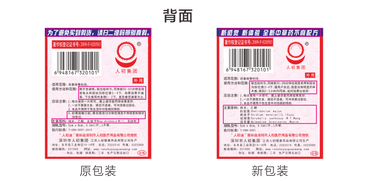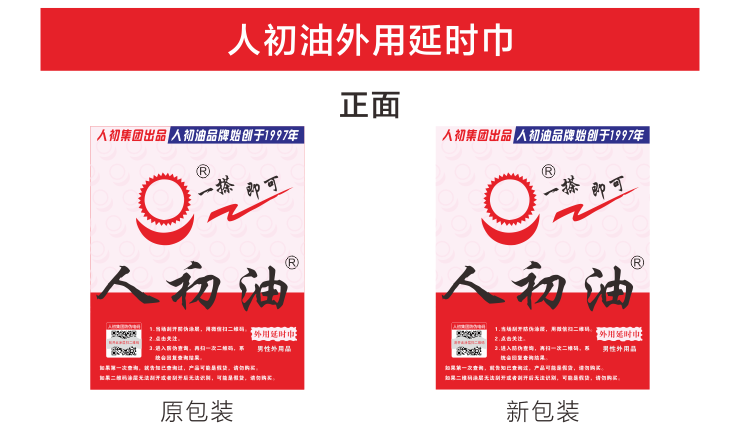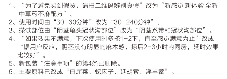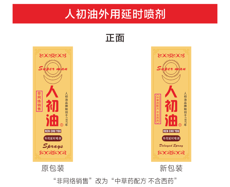 現在網上流行中草藥配方的延時產品,6ml的中草藥延時產品貴的都賣到了600元/支。人初公司作為《外用延時劑》團標和《生殖健康用品企業生產管理規范》團標的主要起草者,理應走在同行的前面。為此,從2021年1月開始,保健品市場的人初油外用延時噴劑和人初油外用延時巾將陸續推出新款的中草藥延時產品。新款的人初油外用延時噴劑和人初油外用延時巾的包裝盒和老款的有點不同。并且新款的人初油外用延時噴劑也由15ml改為10ml。敬請大家注意!為了不影響實體店代理商的銷售,延時噴劑和延時巾兩款產品暫不漲價,但大家千萬不能拿產品到網上去銷售。老款的延時噴劑和延時巾陸續停止供貨。中草藥配方的延時產品用后陰莖不麻痹、口部接觸也不麻口,對快感影響也較小,有效時間更長。但中草藥延時產品是通過熱感刺激陰莖改善房事時間,所以一些陰莖敏感的人會有熱刺感。一般情況不用處理,嚴重的可用溫水清洗陰莖,下次使用時少噴一下即可,這一點大家千萬和客戶講清楚。