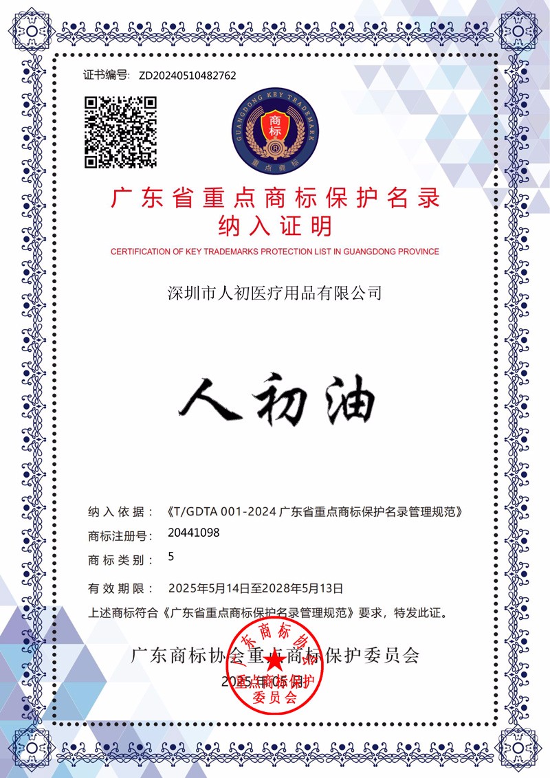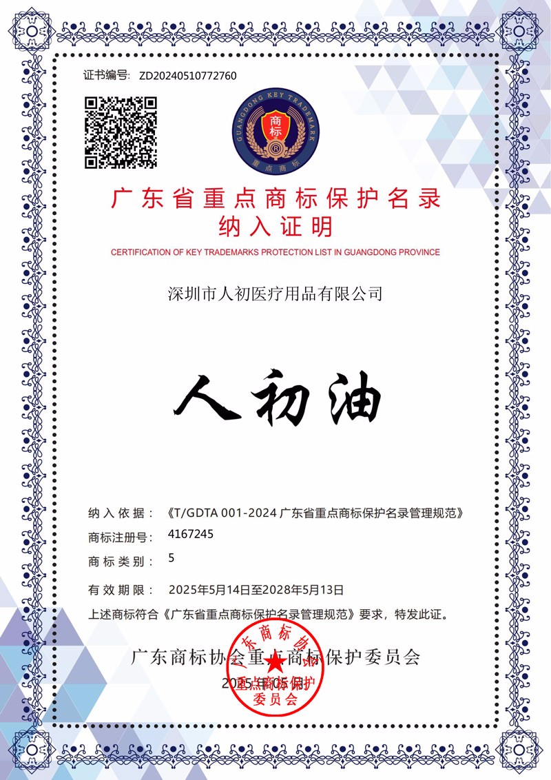近日,廣東商標協會重點商標保護委員會發布公告,猶如春雷乍響,為品牌保護領域注入一劑強心針。在這份備受矚目的《2024年度廣東省重點商標保護名錄》中,深圳市人初醫療用品有限公司旗下“人初油”商標如明珠入匣,被正式納入重點保護范疇,榮膺“廣東省重點商標”這一金字招牌。