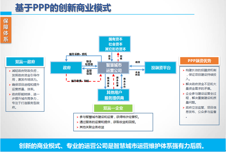 PPP模式由政府購買服務,鼓勵社會資本投入,委托專業(yè)公司運營,可以有效地解決智慧城市建設和運營維護中的一系列難題。